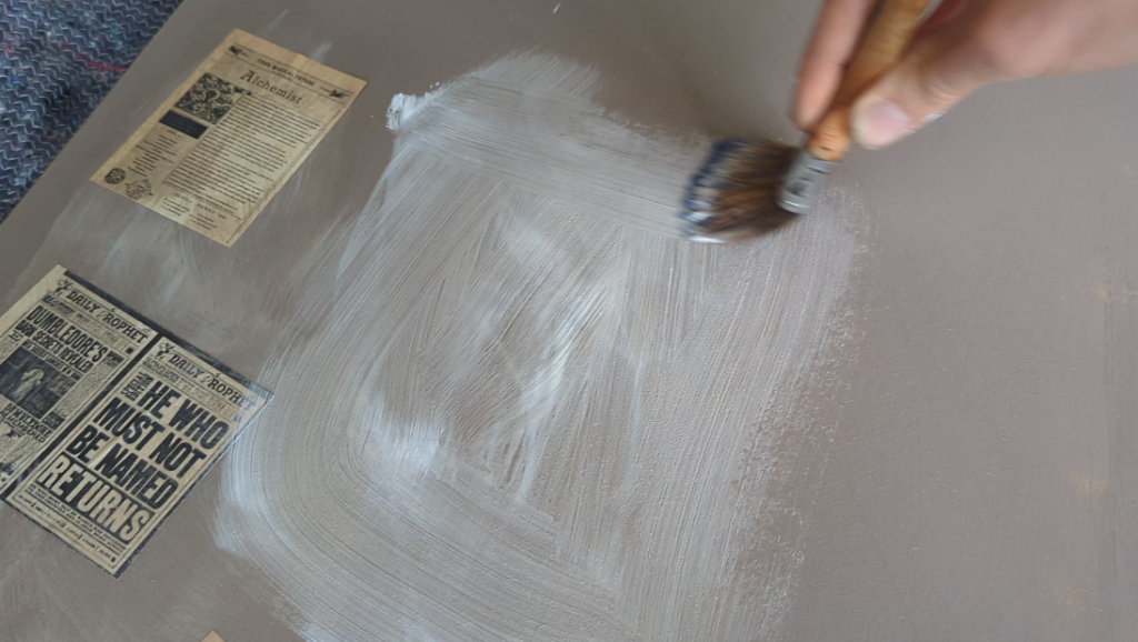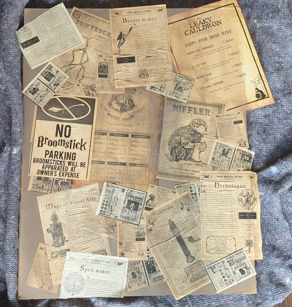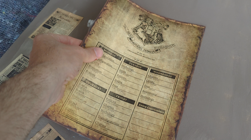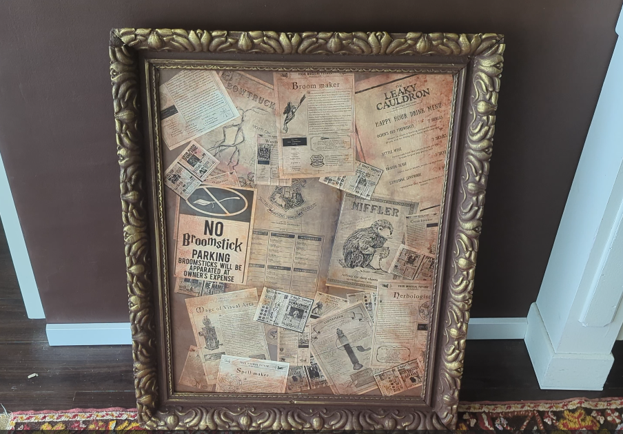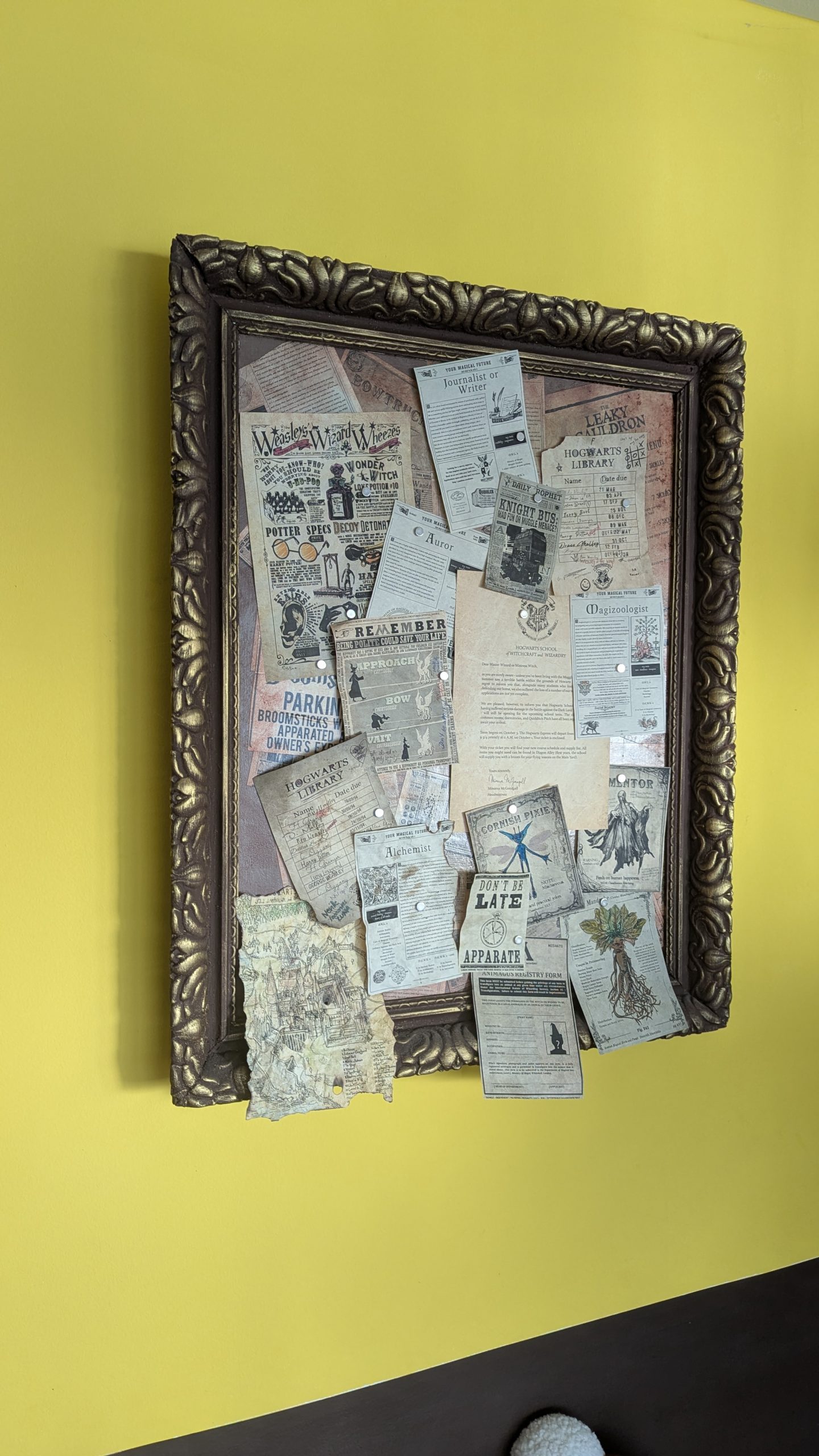I made mine using an old oil painting frame. I used decoupage to apply Harry Potter inspired poster prints to the linen of the frame itself, which gave it a completely different look before I even touched the backing. Then I attached a thin metal sheet to the back of the canvas, which is all you need to make magnets stick. The result is a wall piece that’s both decorative and genuinely useful.
