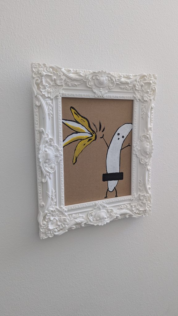 Before you put anything on the wall, plan the layout on the floor. Arrange your frames until you’re happy with the balance, then take a photo of the arrangement for reference. Trace each frame onto paper, cut out the shapes, and tape them to the wall to map the positions before committing to anything permanent. Once you’re happy with the layout, hang everything using command strips.