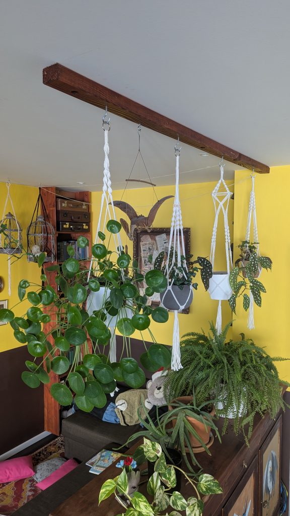 Tip: The hanging row of pots works especially well between a sleeping area and a desk or reading corner. It creates a gentle visual separation without closing off the space the way a wall or curtain would.