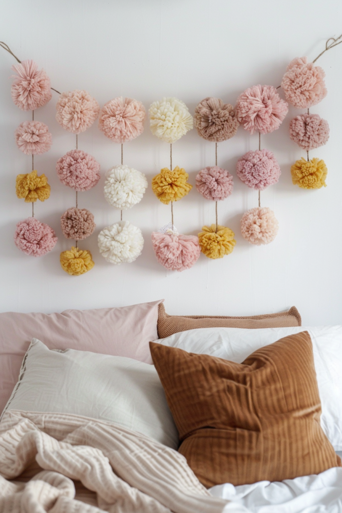 Wrap yarn around a piece of cardboard about 50–60 times. Slide the wound yarn off carefully, tie a separate piece of yarn tightly around the center, and cut the loops at both ends. Fluff out the cut ends and trim any uneven pieces to shape the pom-pom into a round ball. Repeat to make as many as you want. Thread each pom-pom onto twine, spacing them evenly, and hang the finished garland across a wall, above your bed, or along a shelf.