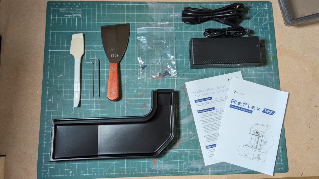 In the box, you’ll find everything you need to get started. A user manual, a metal scraper, a silicone scraper, cables, and basic tools. What’s missing, though, is resin and a replacement film for the vat, so make sure to grab some before your printer arrives.