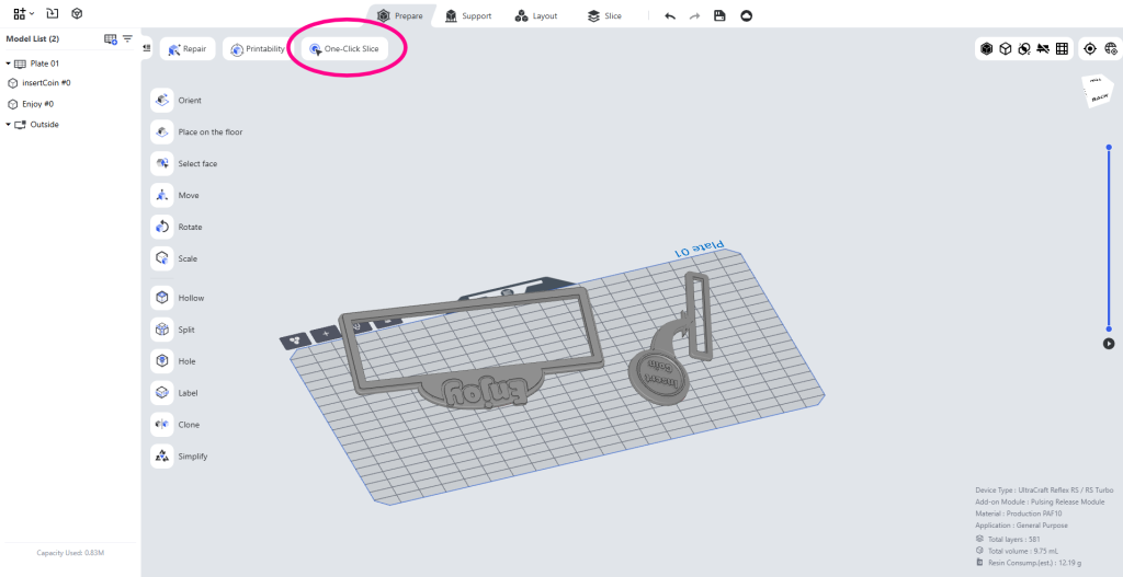 Then simply click on “One Click Slice” and Blueprint Studio will orient the models, add supports, arrange the models on the build plate, slice the models, and finally send them to your printer. All without a single manual step on your side. Except for clicking one button, of course.