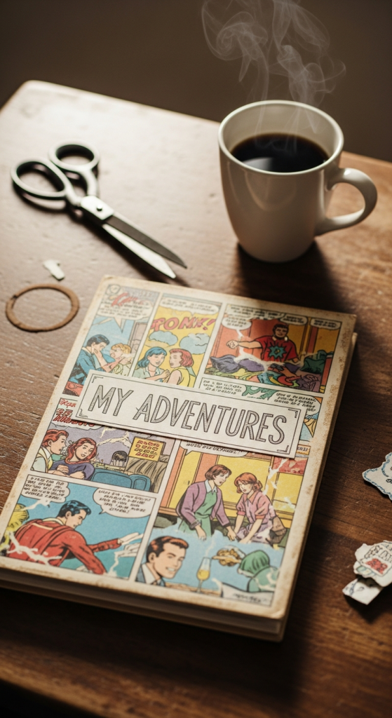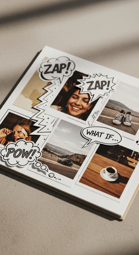 Design your scrapbook like a comic book where the two of you are the main characters. Create panels that show: