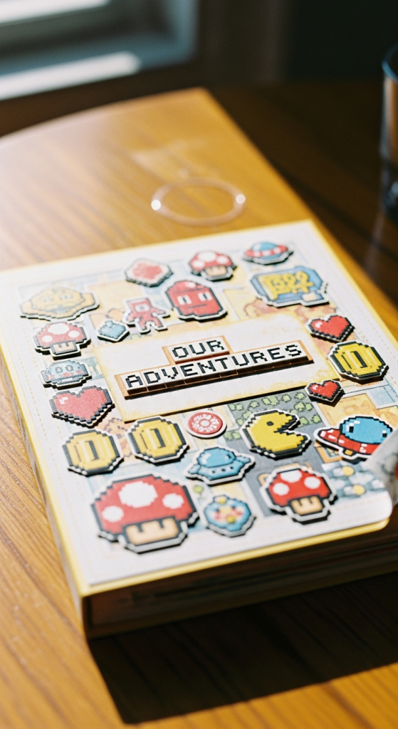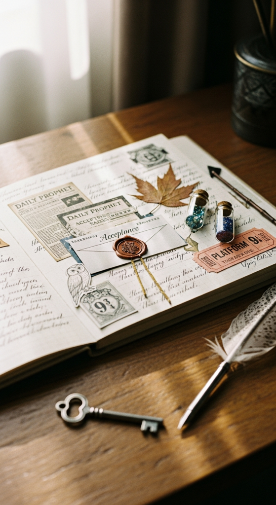 Design the scrapbook like a spellbook or a Hogwarts acceptance letter. Use parchment-style paper, wax seals, and handwritten notes. Dedicate pages to “chapters” of your relationship. Like different years at Hogwarts.
